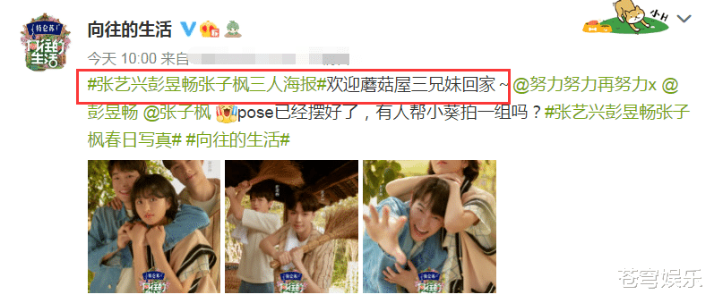 那在上午,《向往》官博再曝新物料,这回发的就是三个“孩子”的海报,蘑菇屋三兄妹的写真大家看了吗?这一组三兄妹的海报着实有趣。