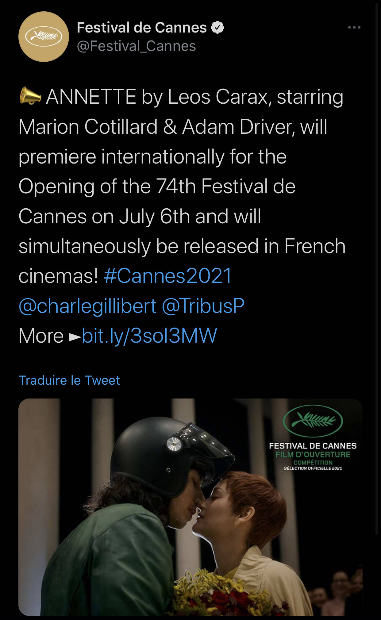搜狐娱乐讯 据戛纳国际电影节组委会官方消息,亚当-德赖弗、玛丽昂-歌迪亚主演,《新桥恋人》导演莱奥-卡拉克斯执导的首部英语片《安妮特》将作为第74届戛纳国际电影节开幕片,同时入围主竞赛单元,本届戛纳电影节官方片单将于5月底宣布,线下活动推迟至7月6日-15日举行。
