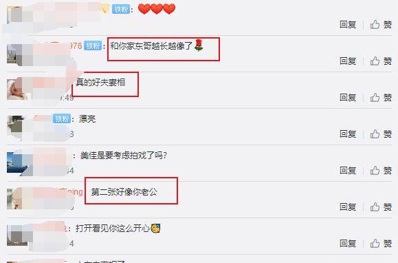 网友看后纷纷留言,“和你家东哥越长越像了”“真的好有夫妻相”“第二张好像你老公”。