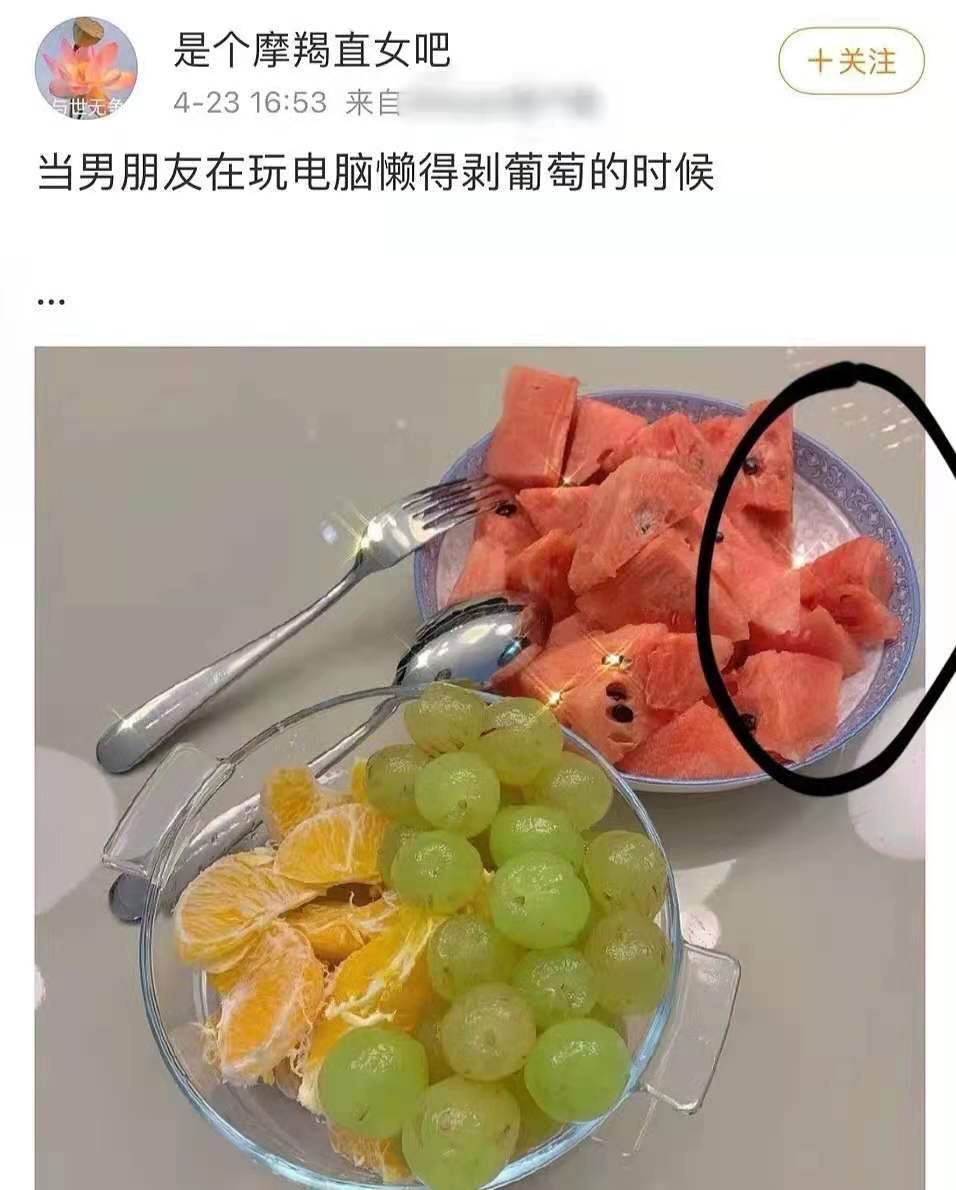 4月23日,张允恩也晒出了同款盘子装着的水果,甚至非常直接的发出了文案:当男朋友在玩电脑懒得剥葡萄的时候↓