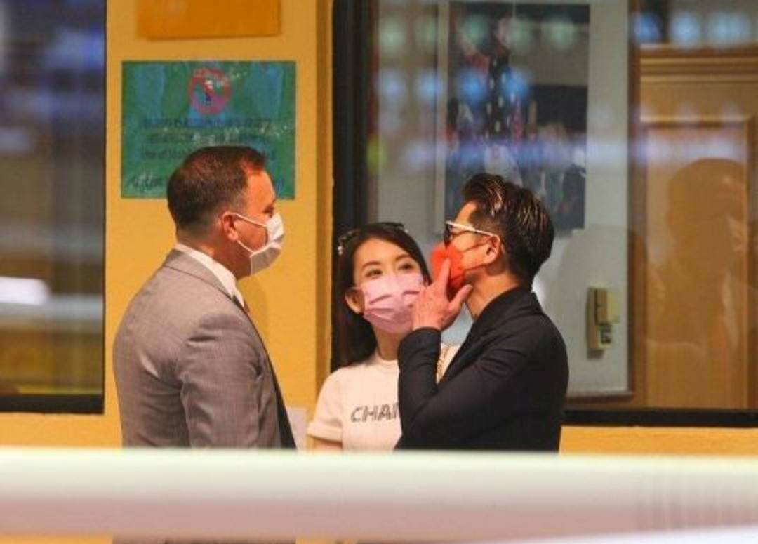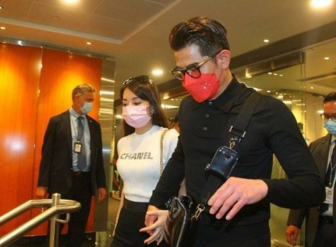 郭富城穿着一身黑色西装,戴着一个红色口罩,看起来很精神。方媛则是一身紧身穿搭,小蛮腰大长腿,身材很好。