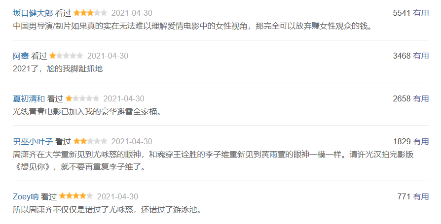 但这部讲述了一对恋人15年的爱情长跑故事,号称所有观众看了都流泪的影片,口碑却不佳,豆瓣评分仅为5.2,未到及格分数。从电影上映就有很多观众问,是不是自己老了。但当电影上映几天后,豆瓣短评热评区已经全部被差评占据。