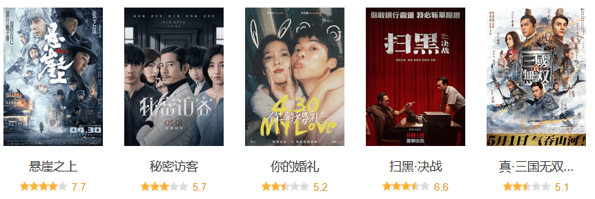 其他重头影片:《秘密访客》5.7分,《真·三国无双》5.1分,《追虎擒龙》5.6分,《阳光劫匪》4.5分,表现均不如人意。