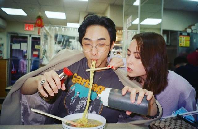 哈利吃面的时候,双手拿着各种酱料往碗里倒,无名指上戴了一个戒指十分惹眼,而该女生则亲手喂他吃面条。