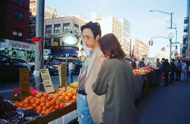 二人站在水果摊前,女生依偎在哈利的肩膀上,有种小媳妇儿的感觉,像个贴身小挂件般粘人。