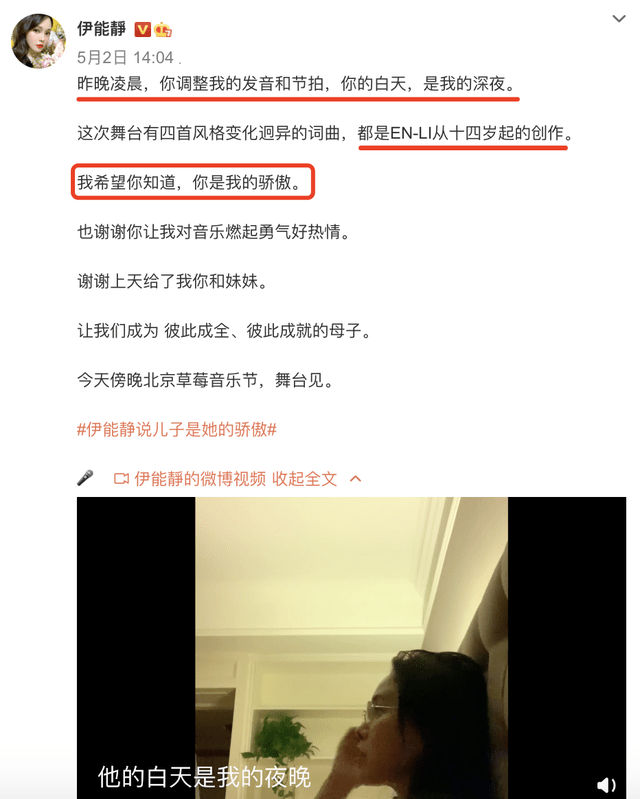 这次舞台上,伊能静称自己唱的歌都是儿子从14岁以来的创作,因为存在时差的问题,伊能静只能晚上和哈利连线,一起研究唱法,伊能静也不忘发文告白儿子:你是我的骄傲!