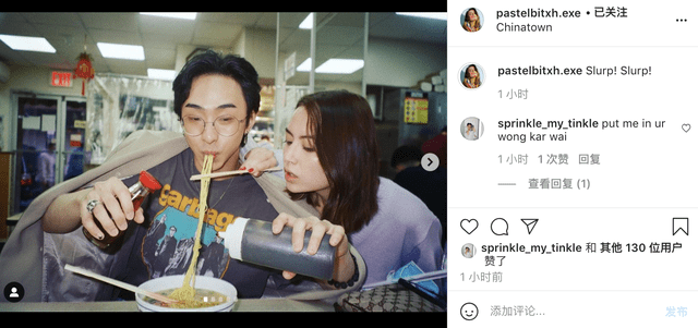这还不够,两人还吃同一根面条,一人叼着一头,让人不禁想到很多新人结婚那天,都会有这一操作,最后将嘴吃到一块儿去。