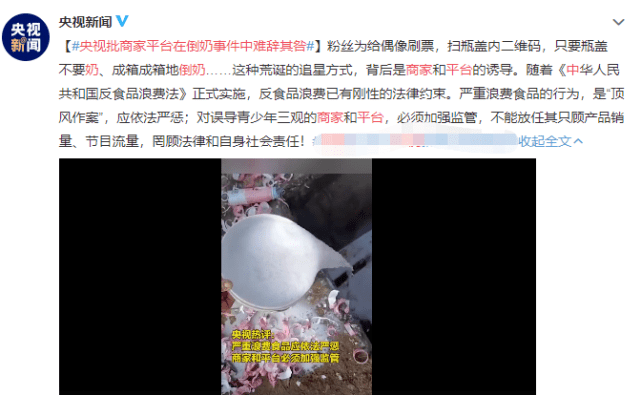 随后节目面临的就是群众的举报,最终《青春有你3》节目停播整改,5日针对“为追星投票倒27万瓶牛奶”的行为,央视也发文批评,称商家平台在倒奶事件中难辞其咎。这件事或许涉嫌违法,讽刺的是前一天刚实施《反食品浪费法》。