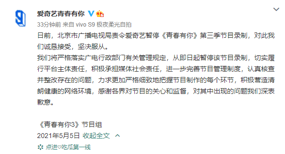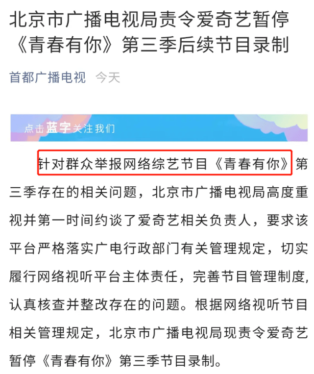 近日选秀节目《青春有你3》引发了网友们的热议,从选手到比赛机制上都被外界质疑。5月4日北京广电发布声明约谈《青春有你3》节目相关负责人要求对方落实广电行政部门有关规定,节目被要求暂停录制,认真核查并且整改自身存在的问题。