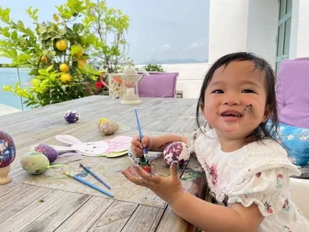 照片中,陈少霞和女儿一起坐在阳台上,手把手教孩子涂鸦彩蛋,小姑娘白色的连衣裙上沾满了彩色的颜料,就连手上脸上都不能幸免。