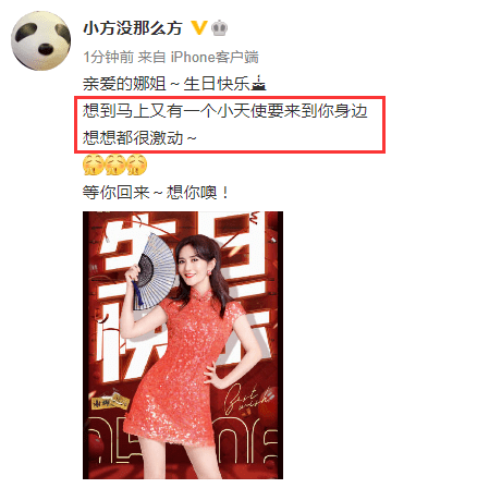 《快乐大本营》导演小方也在凌晨祝福:亲爱的娜姐,生日快乐,想到马上又有一个小天使要来到你身边,想想都很激动!等你回来,想你。