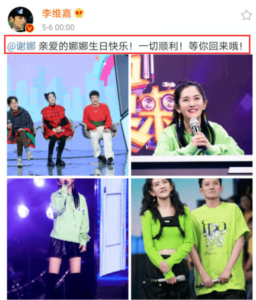 5月6日凌晨,李维嘉率先在社交平台为谢娜庆生,他艾特谢娜并配文:亲爱的娜娜生日快乐,一切顺利,等你回来哦。