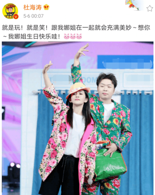 杜海涛不愧是搞笑担当,直接晒出来两人最好玩的合影。杜海涛穿着绿色印花上衣,谢娜穿着粉红色印花外套,两人花花绿绿搭配很别致啊!