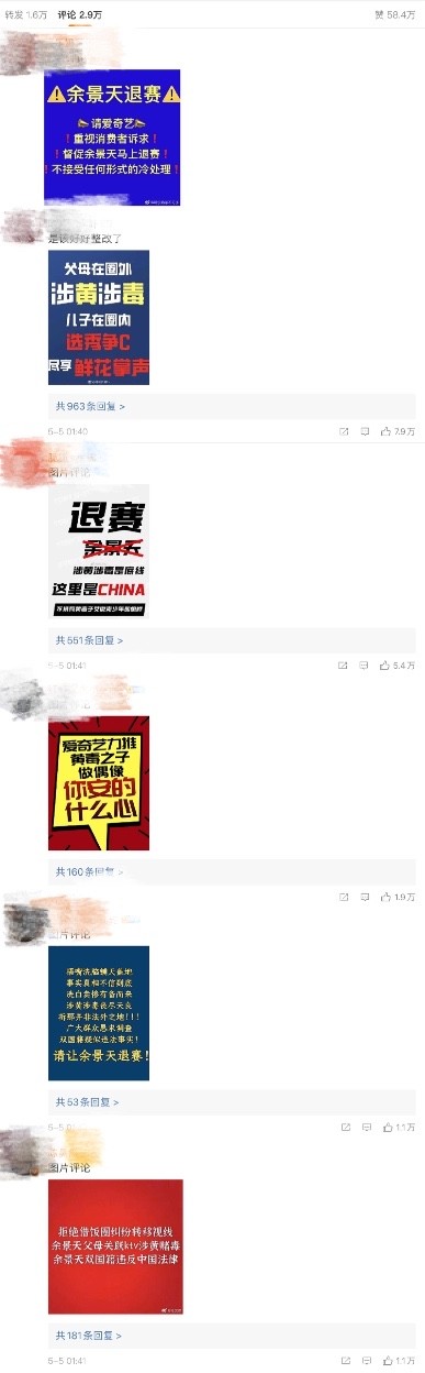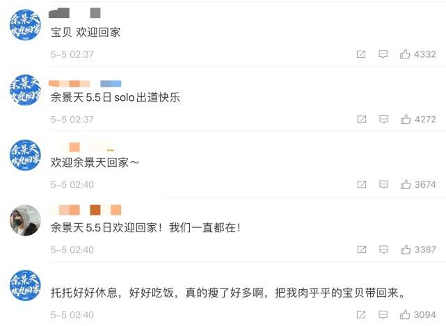 在“星宇愔乐”发布的这则声明下面,几乎全部都是余景天粉丝的留言。奇怪的是,声明里称余景天是因为身体原因退赛,但留言里却没有一个粉丝关心余景天现在的身体状况,几乎是清一色的“欢迎余景天回家”。大概粉丝们都清楚,导致余景天退赛的真实原因并不是其身体状况。