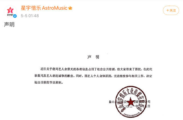在《青春有你》官博发出后几分钟,余景天所在的公司“星宇愔乐”也火速给出一则声明称,对于最近网络上各种关于余景天的各类信息占用的公共资源表示抱歉,而余景天本人也因身体原因将无法继续相关工作,从而决定退赛。