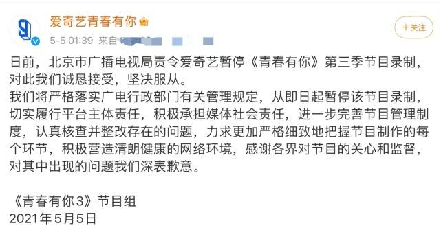 日前,北京市广播电视局责令爱奇艺暂停《青春有你》第三季节目录制,对此我们诚恳接受,坚决服从。我们将严格落实广电行政部门有关管理规定,从即日起暂停该节目录制,切实履行平台主体责任,积极承担媒体社会责任,进一步完善节目管理制度,认真核查并整改存在的问题,力求更加严格细致地把握节目制作的每个环节,积极营造清朗健康的网络环境,感谢各界对节目的关心和监督,对其中出现的问题我们深表歉意。