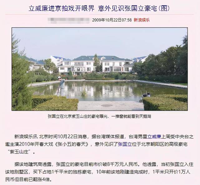 据早期的爆料称张国立拥有一套北京豪宅,2009年时价值8000万。