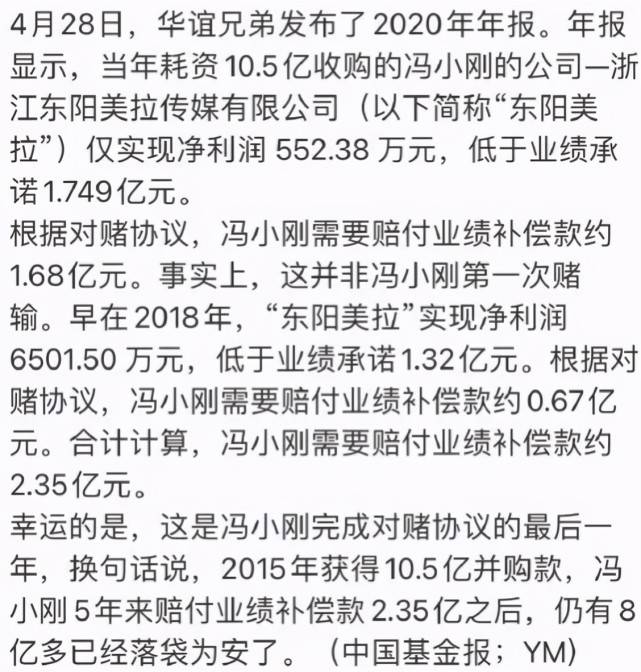 而根据网上的爆料称冯小刚虽然没有完成对赌,需要赔付2.35亿,但冯小刚早已有8亿多落入了口袋,如此看来对赌合约下看似是亏了,实际是赚了。