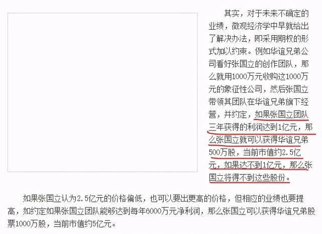 这个代价就是张国立签下了五年的对赌合约,张国立需要每年完成3000万的利润,完成对赌合约后张国立才能得到华谊的股份,否则要自己补足剩余的部分,而且还得不到股份。